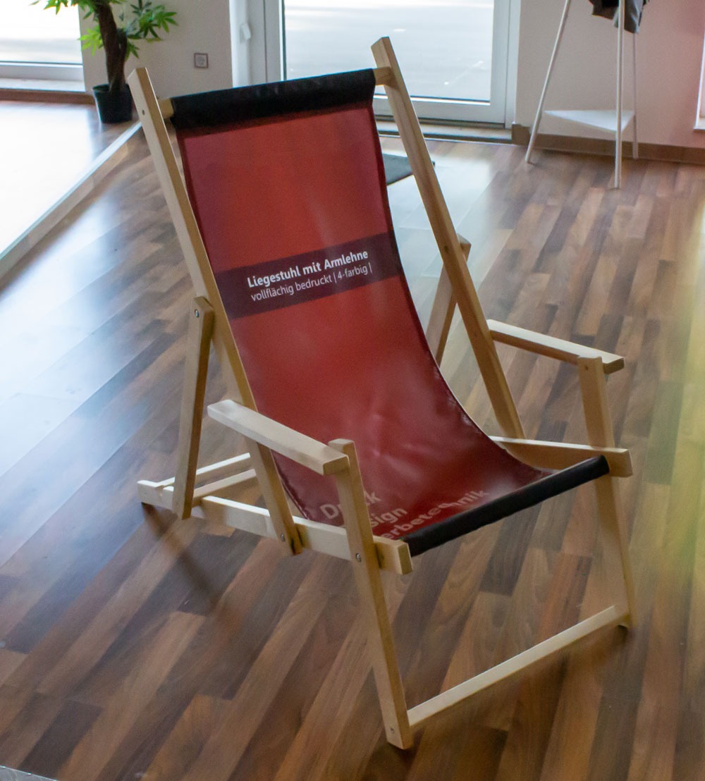 Hochwertige Holzklappliegestühle mit Armlehne mit Monaco Premium Stoff von Vest-Druck aus Herten, Recklinghausen, Herne, Bochum, Gelsenkirchen und Marl. Durch den extrem reiß- und abriebfesten Stoff und dem hochwertigen Latexdruck ist der Stuhl ein echtes langlebiges premium Produkt.